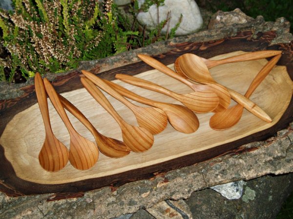 Dezertní dřevěná lžička vyrobená z jednoho kusu dřeva, určená přímo do kuchyně.