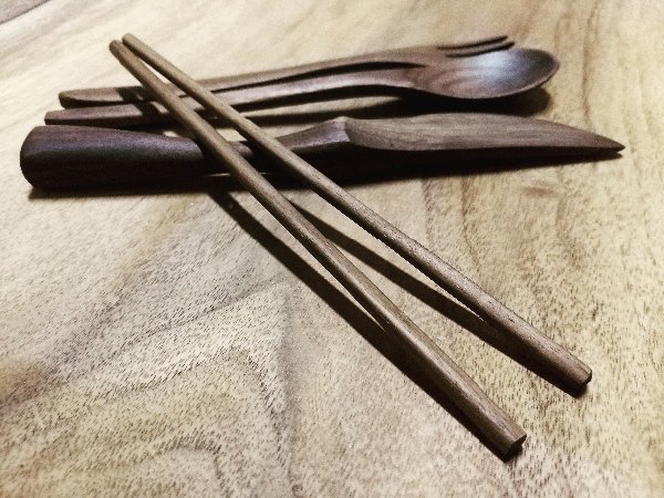 Suschi set obsahuje vidličku, lžíci, nůž a suschi hůlky z ořešákového dřeva.